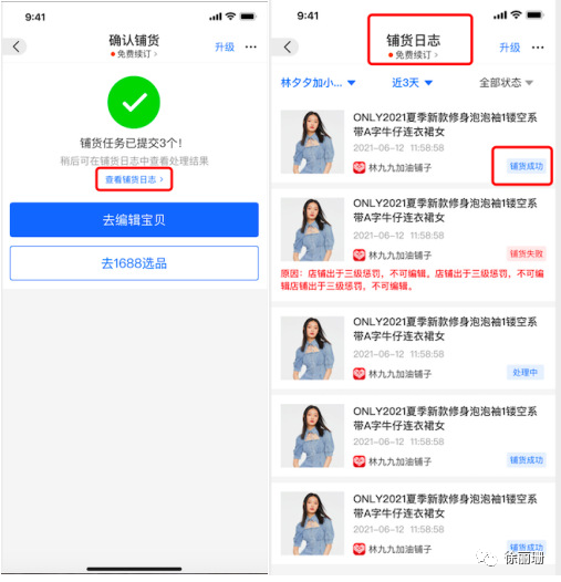 提交后可查看相关铺货日志或重新选择货源继续铺货