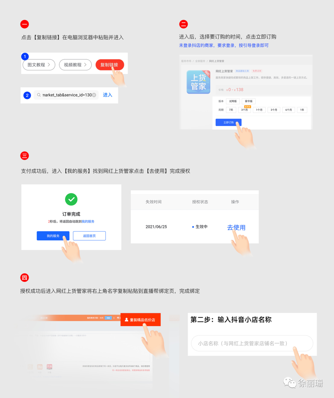 点击【去订购】或者复制订购链接到浏览器,登录抖音或快手店铺后完成订购② 完成店铺授权:复制授权链接到浏览器打开,登录已订购完成的抖音、快手店铺完成授权。