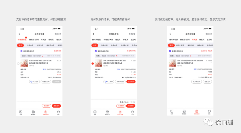 订单支付结果① 支付中的订单不可重复支付,付款按钮置灰② 支付失败的订单,可继续操作支付③ 支付成功的订单,进入待发货,显示支付成功,显示支付方式