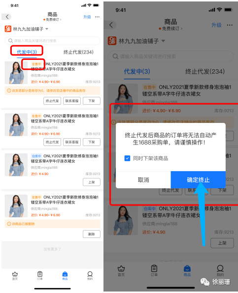 3、下游店铺商品状态1)下游店铺完成铺货后,店铺商品处于在售中状态,均可以代发,终止代倒爷货源网发后,商品对应的货源将解除绑定关系。