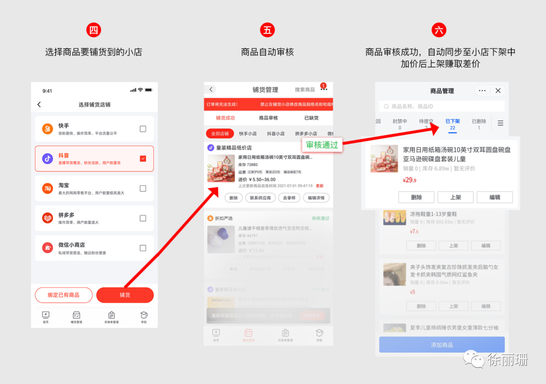 ④选择【抖音】店铺后,等待商品审核成功⑤审核成功的商品在您抖音小店的商品管理中查看,可编辑商品加价售卖