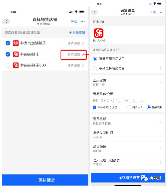 2、商品铺货流程1)绑定授权好的店铺,点击选中要铺货的店铺,点击铺货设置,可以设置铺货商品参数,设置完成后,铺货商品的商品信息会根据设置的项进行自动修改。