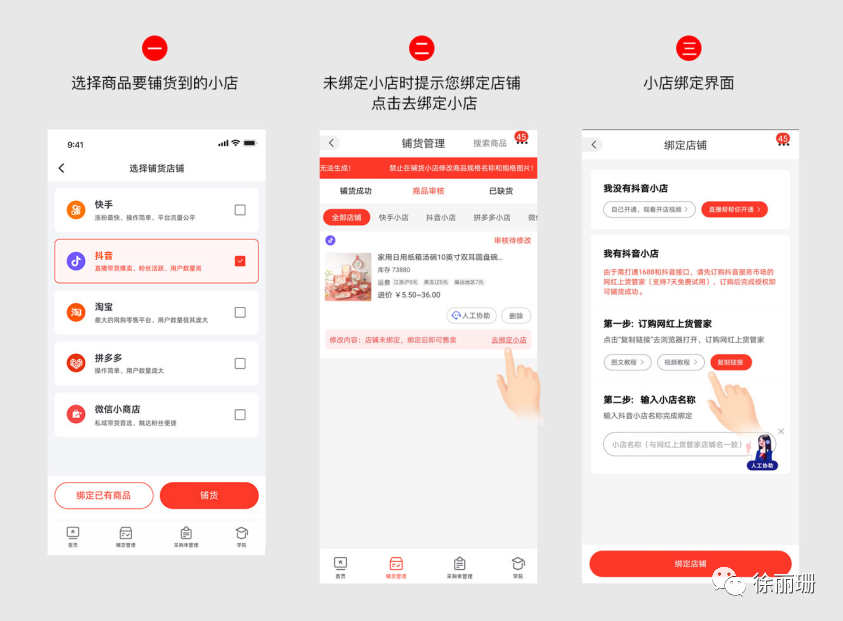 2、店铺绑定:自动分销绑定入口:①进入自动分销,选择要铺货的店铺-抖音②商品列表中,按提示点击【去绑定小店】