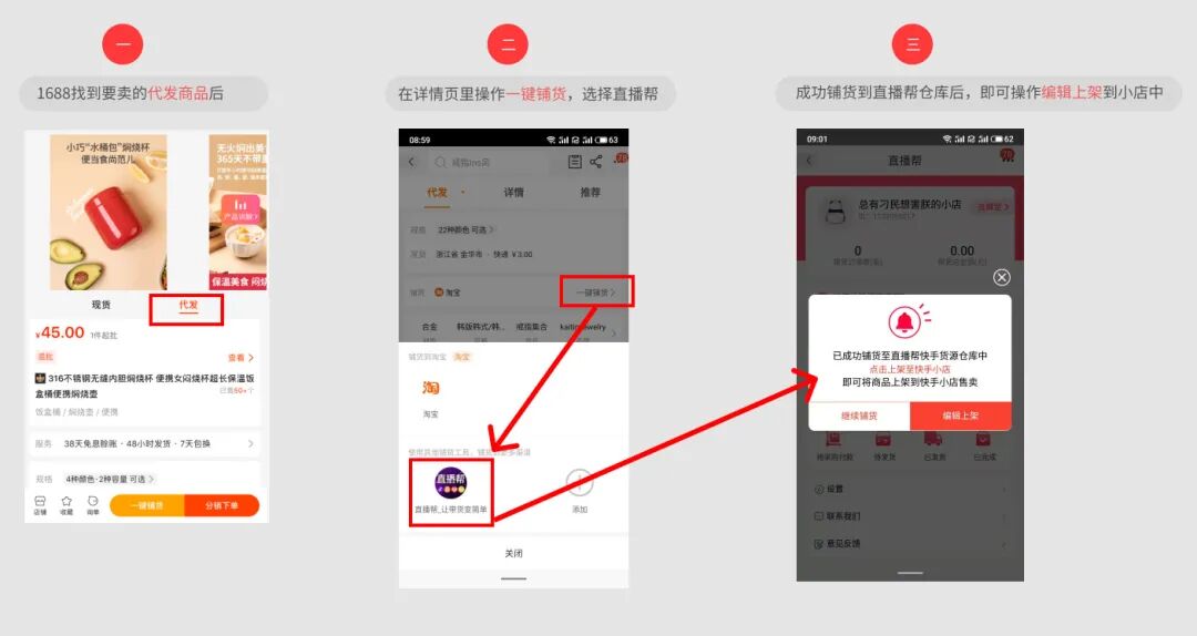 如1688侧未订购“直播帮”铺货工具,可参考上面第四点铺货快手步骤:(1)在168倒爷货源网8登录后,选择支持“代发”的商品,在详情页中找到一键铺货,选择“+”号设置,(2)选择“直播帮_让带货变简单”应用工具,点击