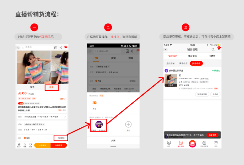 首次订购流程:1688A倒爷货源网PP-找到支持代发商品-进入商品详情页-选择“代发”-点击“一键铺货”-点击“+”订购“直播帮免费版”手机端订购链接点此直达