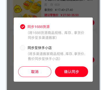 4、直播前建议在“直播帮”先同步下1688商品最新货源信息(商家侧可能会有价格、库存变化),如需要更新到快手小店,则再点击“同步至快手小店”目前同步1688商品信息不包括运费模板,请提前跟商家确认好倒爷货源网不包邮地区