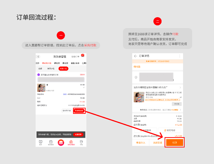 5、用户在快手小店支付下单后,快手小店订单管理中,出现该笔订单;同时,通过接口将订单同步到直播帮和1688订单管理中;用户可前往直播帮,找到此订单,操作去采购付款,即可跳转到1688对应订单,去完成支付,支付后,商品开始由商家安排发货,商家只需等待用户确认收货,订单即可完成。