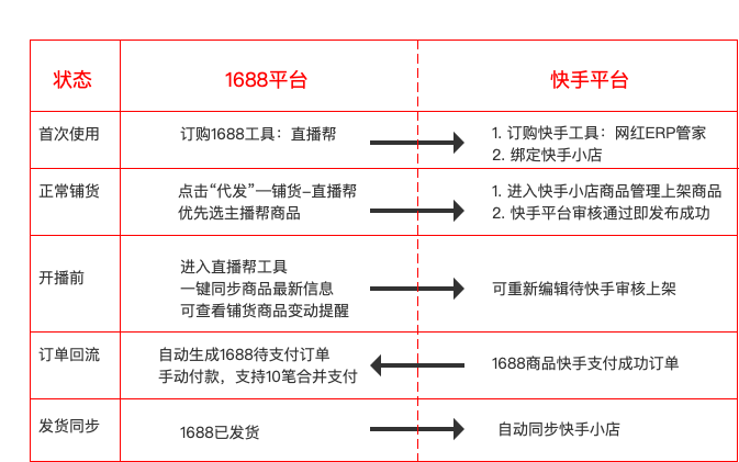 支持商品一键铺货到【直播帮】可进入直播帮修改商品信息,一键发布到抖快平台当抖快平台有订单生成后自动回流到1688“待支付”订单,支付成功后商家发货,物流信息自动同步自抖快小店功能还在不断完善中,每周都会迭代更新,也欢迎大家加钉钉反馈问题和需求。