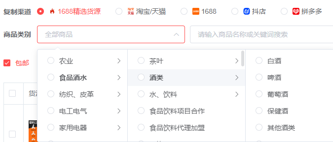 搜索产品关键词一键筛选1688全网的优质低价货源,支持根据类目(可细倒爷货源网化到三级类目)精准筛选,然后从中选择合适的商品一键批量添加到上传列表。