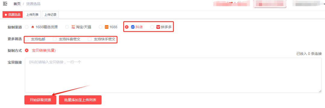 根据实际需求勾选支持包邮、抖音/快手密文下单,快速获取对应货源商品,并选择合适的货源批量添加到上传列表中。