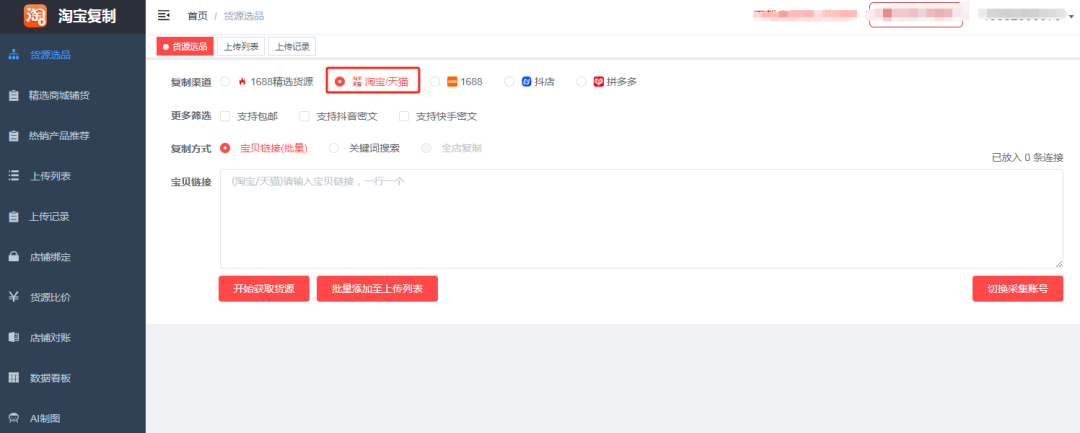 当然,如果你在淘宝/天猫、1688、抖音和拼多多等平台看到某个商品卖得不错,自己也想复制过来卖,也可以用这个工具来快速筛选同款低价货源。以复制淘宝商品为例,复制渠道选择“淘宝/天猫”: