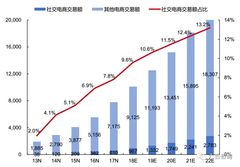 6,099亿,年复合增长率100.6%;预计2022年社交电商交易额将达2.8万亿,2017~2022年复合增长率将达35.5%,同时社交电商交易额占电商总交易额比例将由2017年7.8%增至202倒爷货源网2年