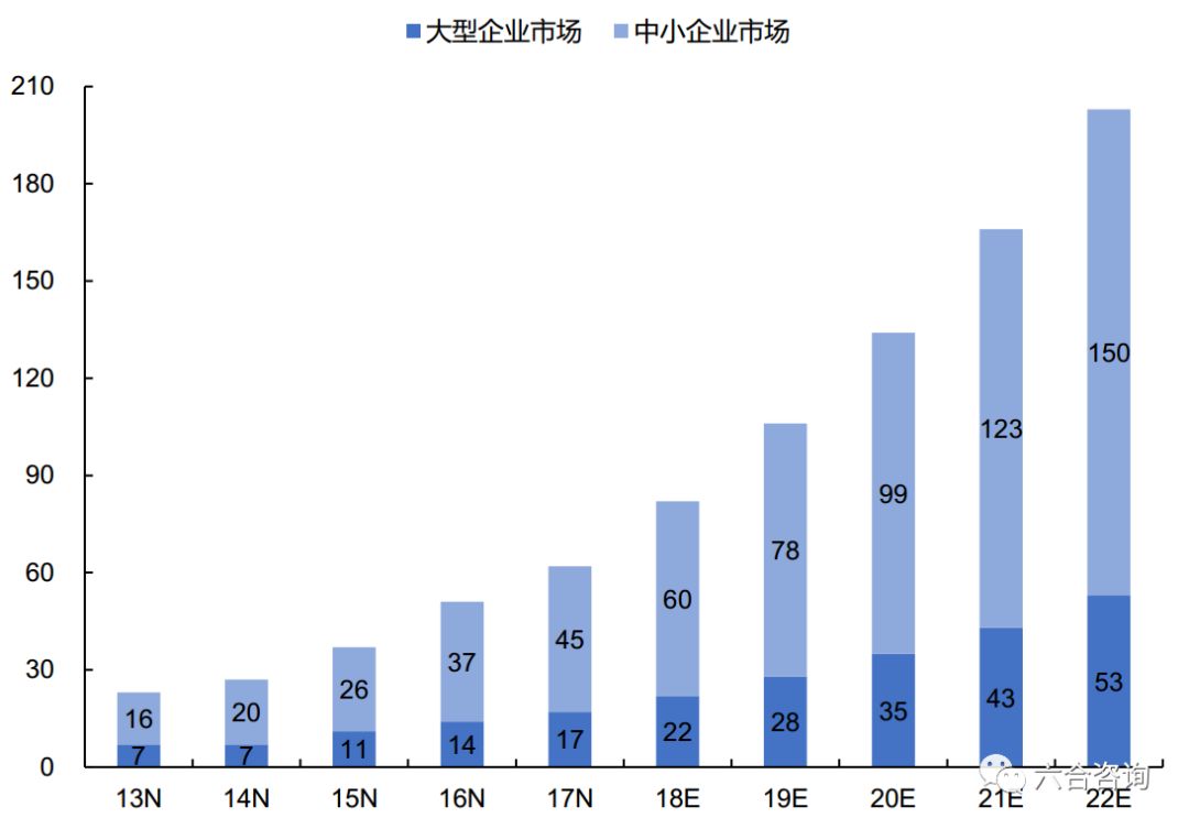中国云端商业与营销服务市场规模,2013~2017年由23亿增至62亿,年复合增长率28.1%;其中,大型企业市场由7亿增至17亿,年复合增长率24.8%;中小企业市场由16亿增至45亿,年复合增长率29.5%