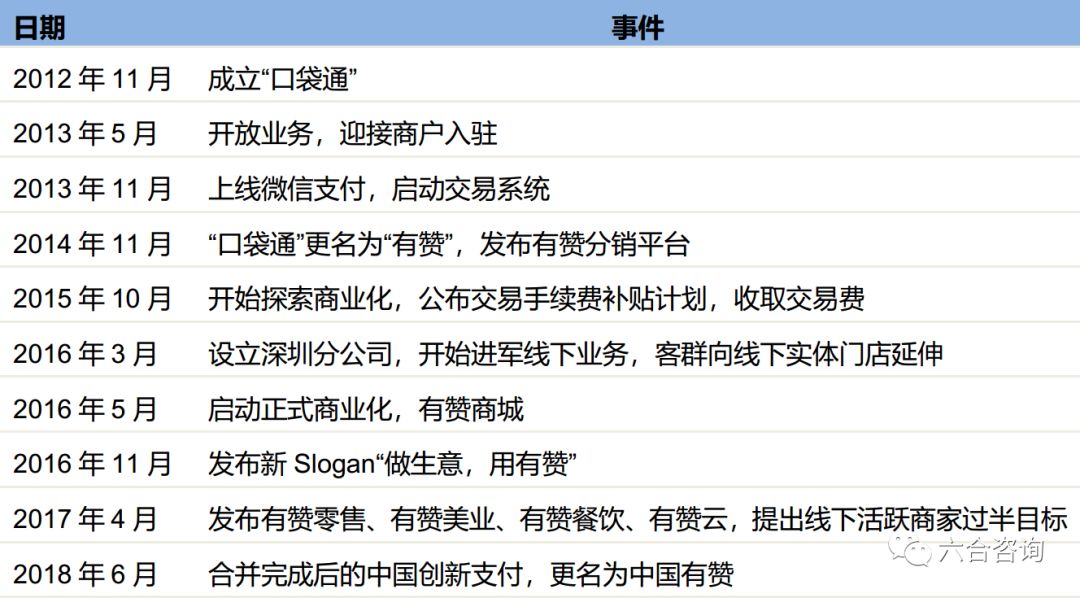 2014年,“口袋通”更名为“有赞”,发布有赞分销平台;2015年,开始探索商业化,公布交易手续费补贴计划,收取交易费;2016年,设立深圳分公司,开始进军线下业务,客群向线下实体门店延伸;2017年,发布有赞零售、有赞美业、有赞餐饮、有赞云等产品,提出线下活跃商家过半目标。