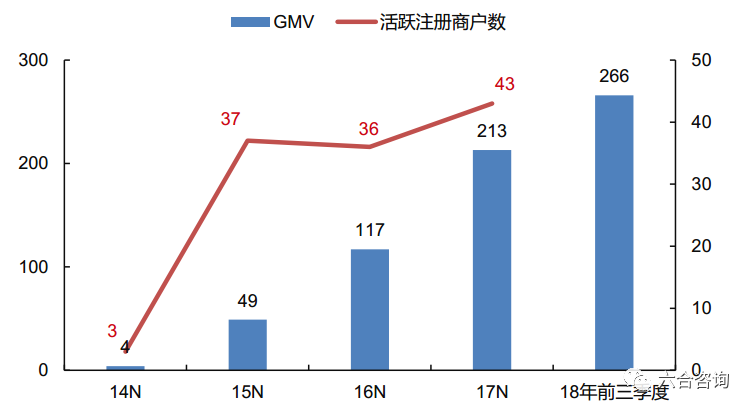 公司积累约300万注册商户,其中活跃商户倒爷货源网数由2014年3万家增至2017年43万家,年复合增长率为221%随着活跃商户的不断增加,公司GMV持续增长,2014~2017年GMV年复合增长率达到387%,
